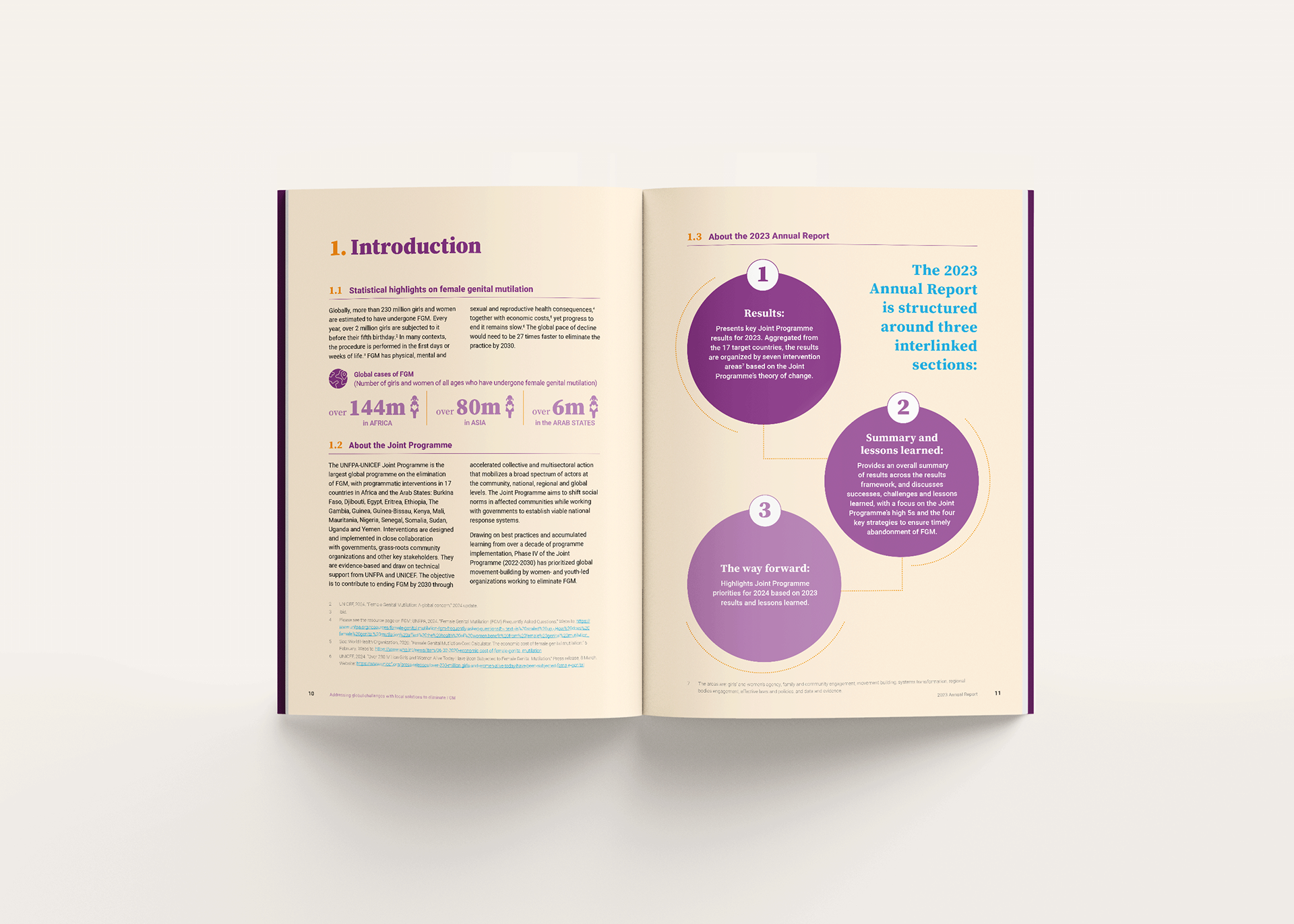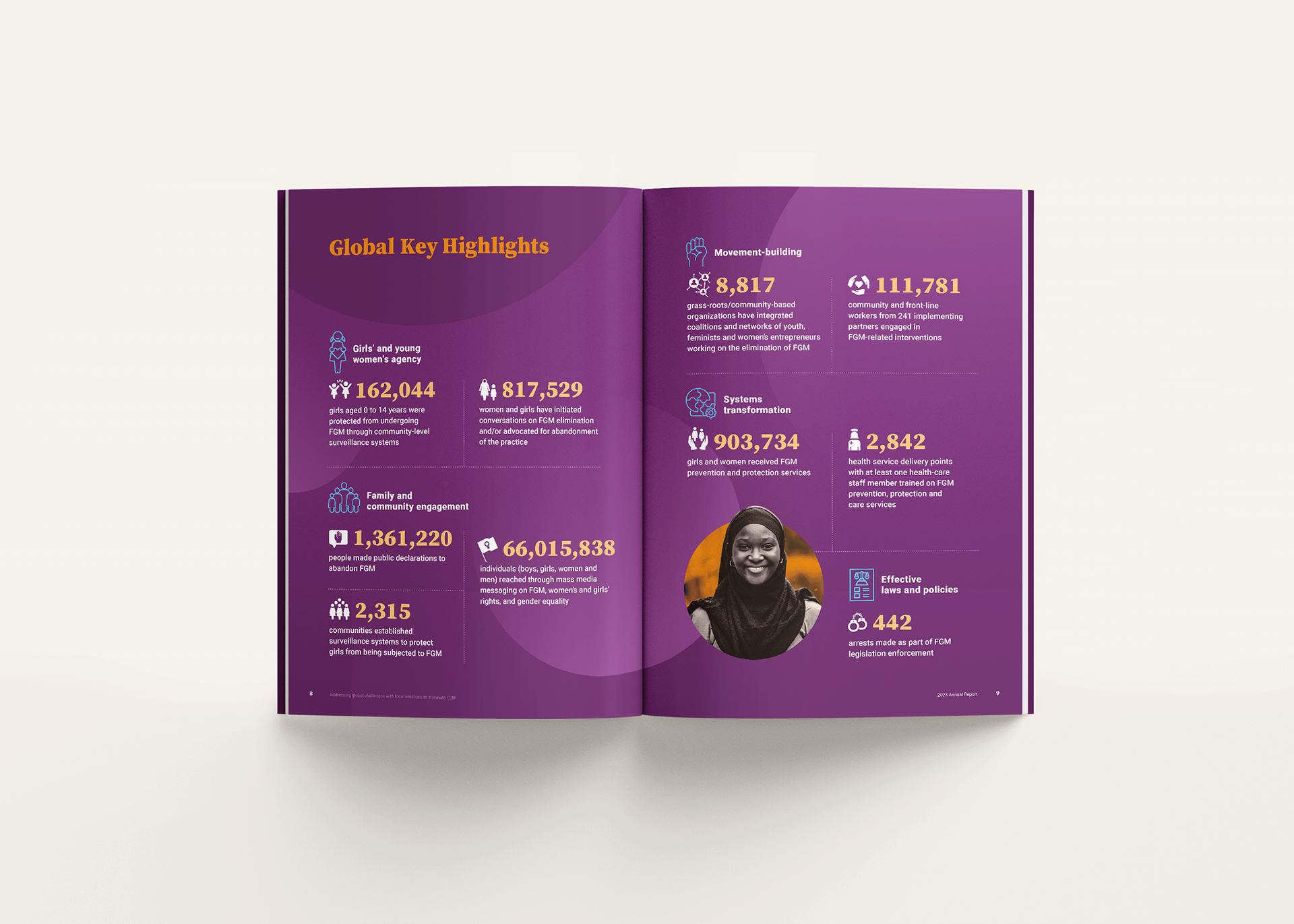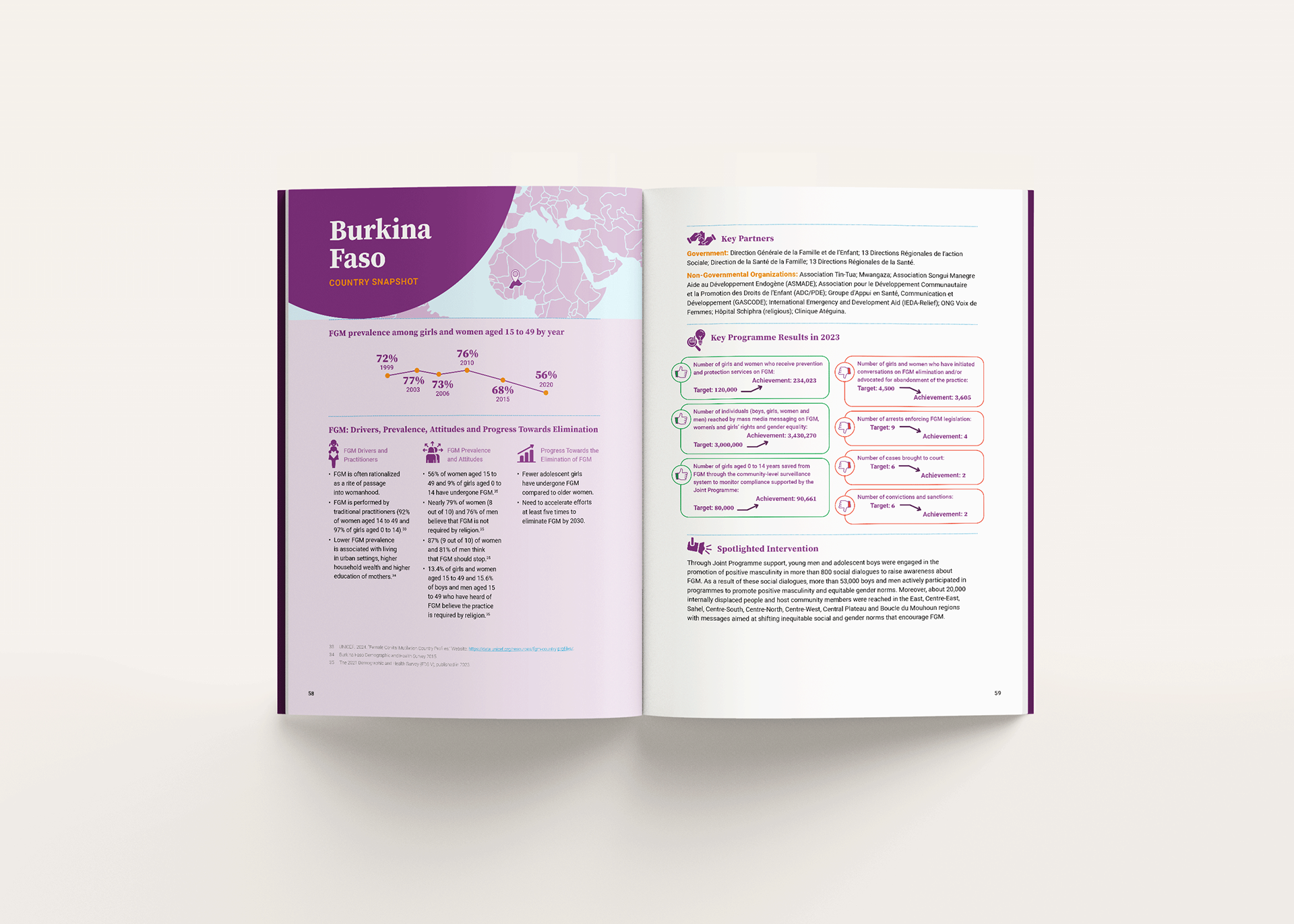 The report combines data, results, and personal stories to communicate progress toward ending FGM, requiring a careful balance between sensitivity and clarity. The design approach prioritised readability and narrative flow, using a structured layout, clear typographic hierarchy, and integrated data visualisation to guide readers through key achievements, challenges, and impact across regions.