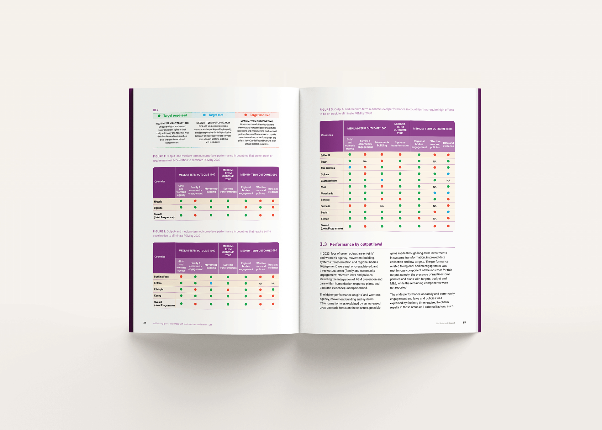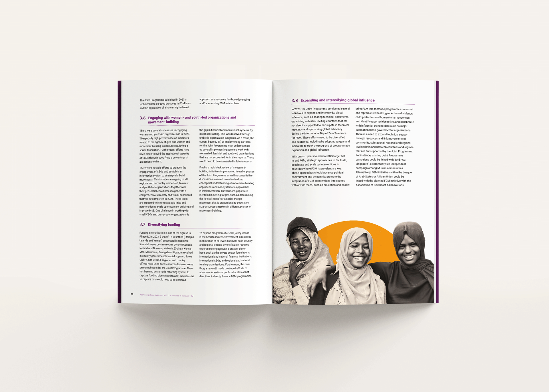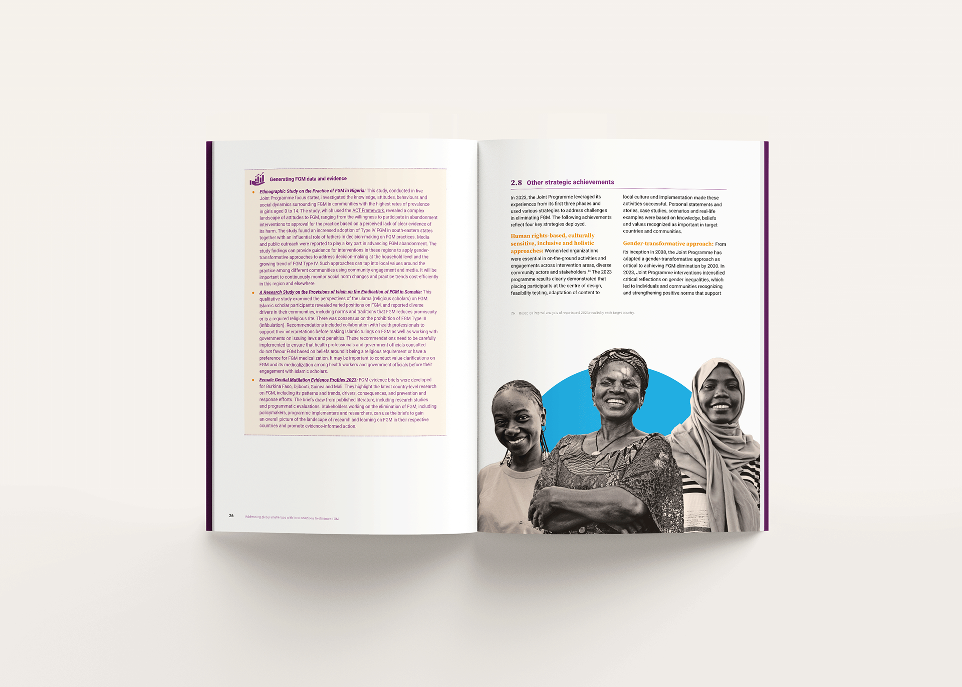 The report combines data, results, and personal stories to communicate progress toward ending FGM, requiring a careful balance between sensitivity and clarity. The design approach prioritised readability and narrative flow, using a structured layout, clear typographic hierarchy, and integrated data visualisation to guide readers through key achievements, challenges, and impact across regions.